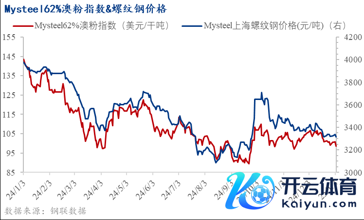 本周铁矿石价钱涨跌互现,截止现在,铁矿石62%澳粉指数98.6好意思元/干吨,环比跌幅0.4%;上海螺纹钢价钱为3316元/吨,环比跌幅0.06%。